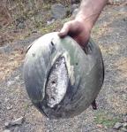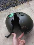 His helmet had this odd discolored patch on it. Like, white against white, but … weird? It’s then that I realized his helmet didn’t have a discolored patch, it had a patch missing. A big chunk of his helmet had just been shaved away, the curve of the helmet gone and sanded flat by whatever it had been scraped against. And running through that patch, from one side of the helmet to the other, was this big crack, like the whole helmet had split like an eggshell.